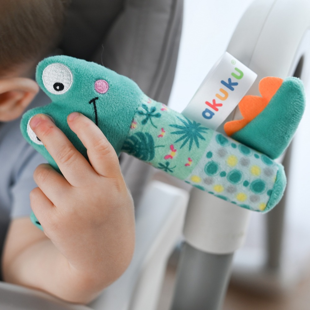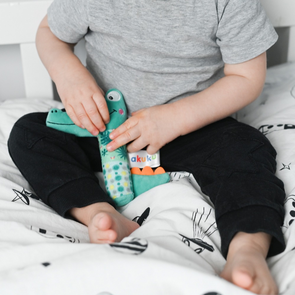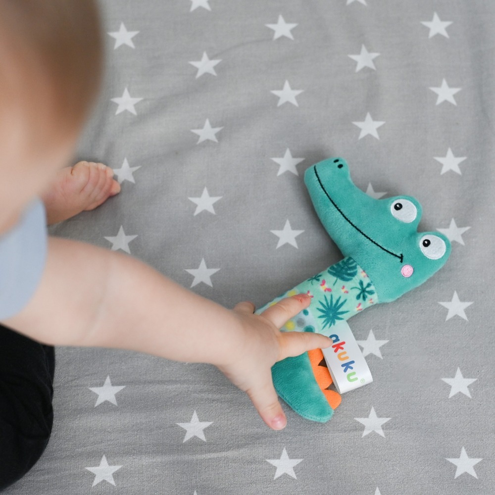 Jucăria zornăitoare de pluș Akuku A0644 Crocodil este concepută pentru a oferi bebelușului o experiență senzorială completă și sigură, stimulându-i dezvoltarea prin joacă.