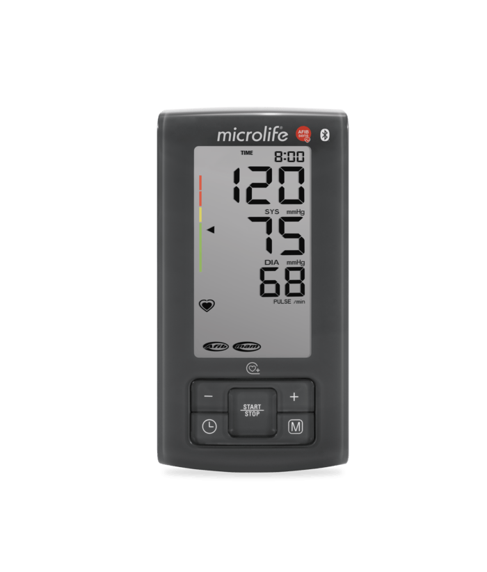 Tensiometrul Microlife BP A6 BT este un tensiometru care permite o masurare corecta si precisa si poate inregistra pana la 99 valori ale tensiunii arteriale. Tensiometrul BP A6 BT detecteaza fibrilatiile atriale periculoase cu ajutorul tehnologiei AFIB, care este la nivel mondial singurul sistem fiabil de detectare a fibrilatiilor atriale disponibil pentru masurarea tensiunii arteriale la domiciliu. Tensiometrul BP A6 BT se conectează la aplicatia „Microlife Connected Health” utilizand tehnologia Bluetooth® SMART si permite monitorizarea pe termen lung a valorilor tensiunii arteriale. Este dotat cu o manseta conica pentru o acuratete optima.