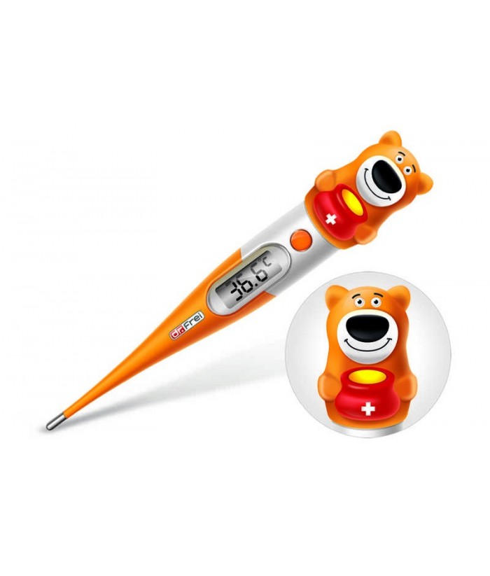 Termometru digital Dr. Frei T-30 este în special destinat copiilor, având design prietenos și tijă flexibilă pentru confort.